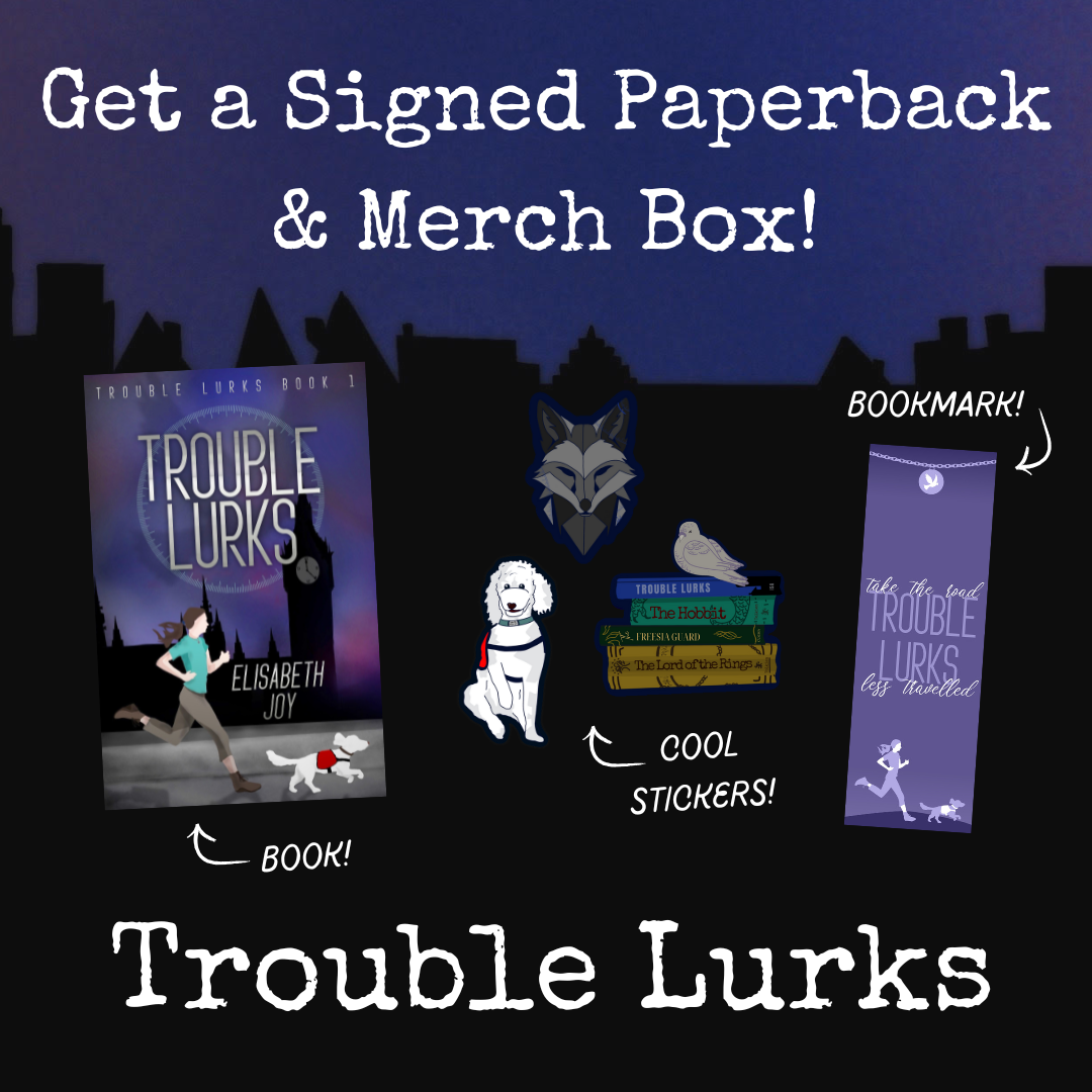 Signed paperback of Trouble Lurks, with stickers and bookmarks.
